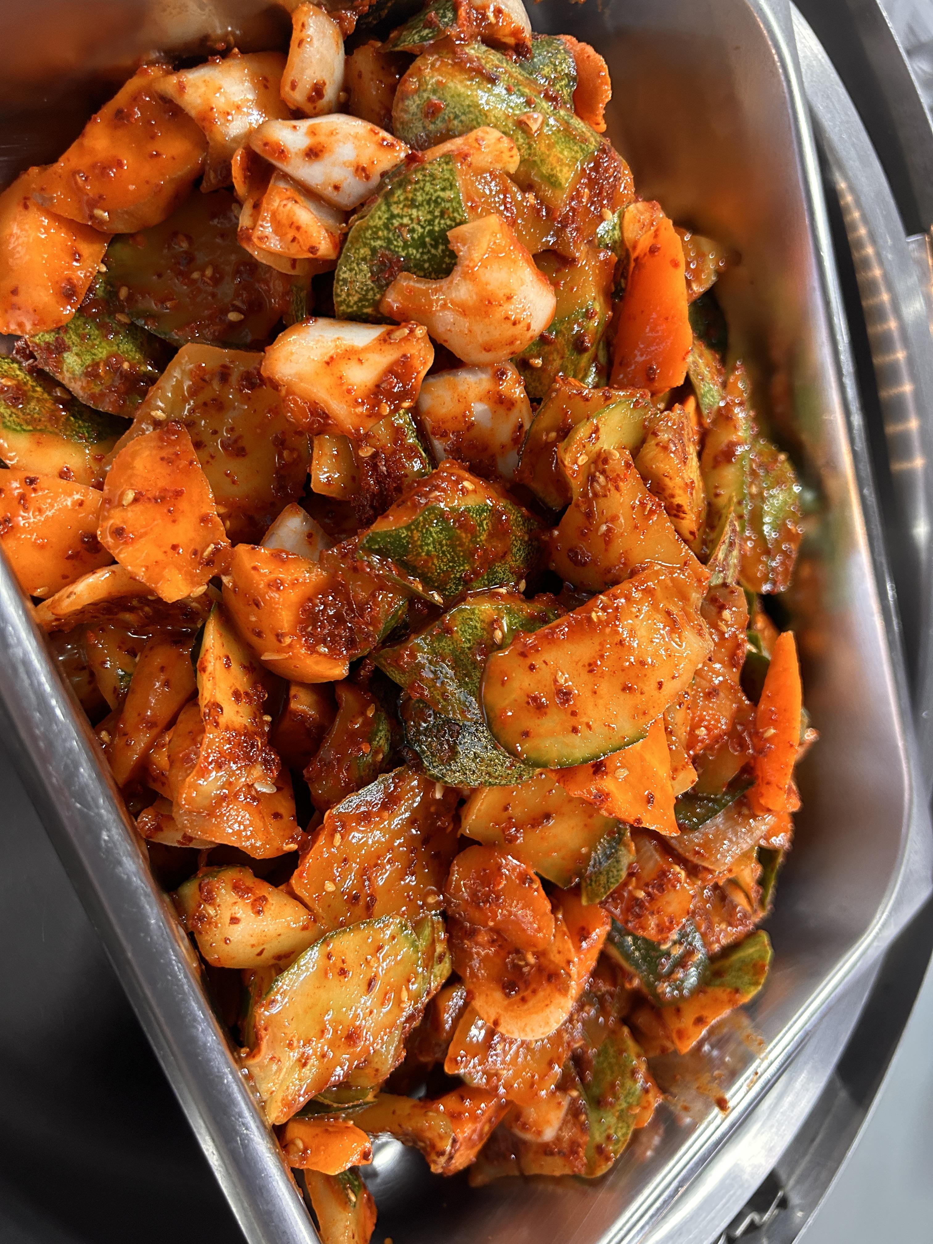 2023년 6월 메뉴개편! 제육쌈밥! : 제육볶음, 쌈채소, 야채와 쌈장, 마늘, 김치, 오이무침, 감자볶음, 부침개, 등