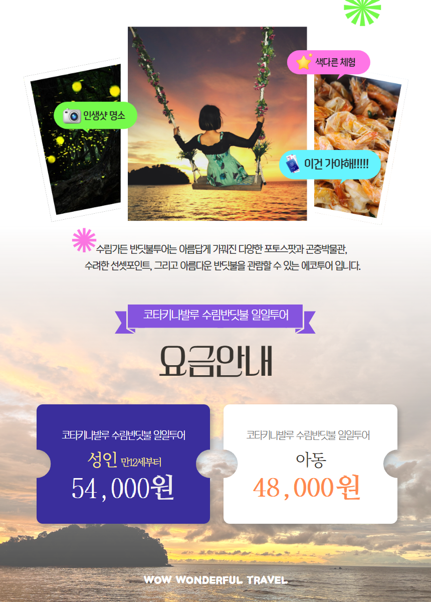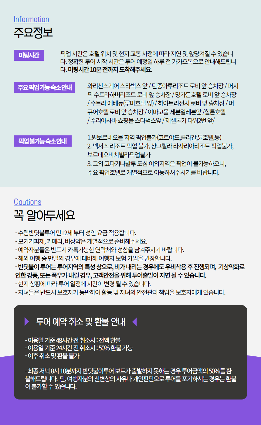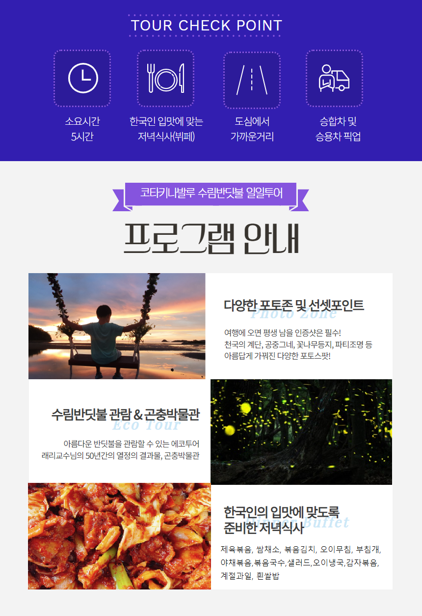 포함사항 : 반딧불투어 픽업샌딩 왕복차량, 수림가든 포토스팟이용, 곤충박물관(Bugs Museum), 저녁식사,